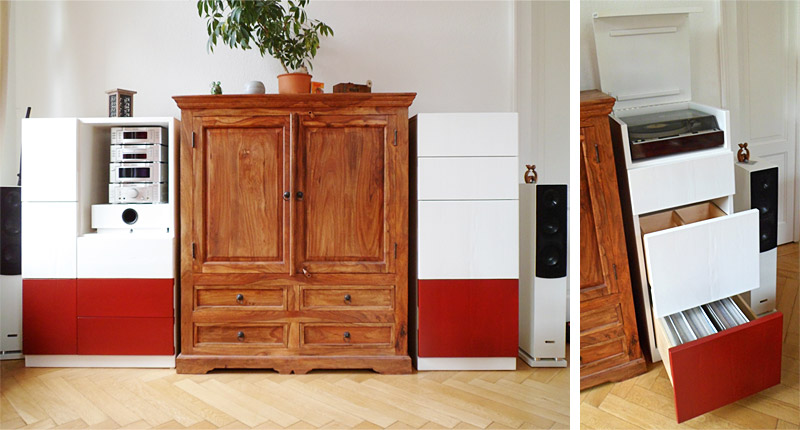 PHONOSCHRANK, WEISS LACKIERT, MIT CD- UND SCHALLPLATTEN-ORDNUNGSSYSTEM, LEIPZIG